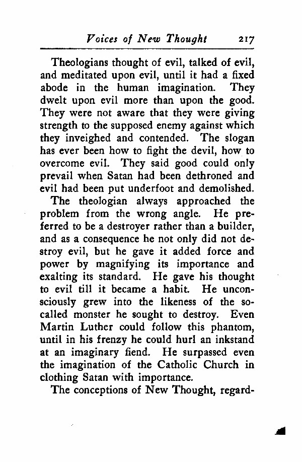 Theologians thought of evil, talked of evil, and meditated upon evil, until it had a fixed abode in the human imagination. They dwelt upon evil more than upon the good. They were not aware that they were giving strength to the supposed enemy against which they inveighed and contended, The slogan has ever been how to fight the devil, how to overcome evil. They said good could only prevail when Satan had been dethroned and evil had been put underfoot and demolished.