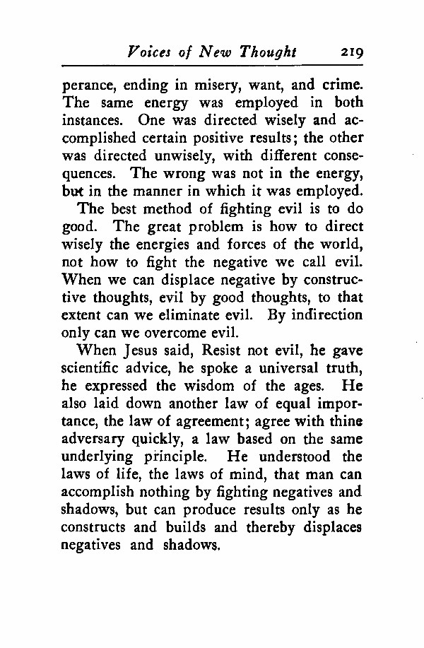 When Jesus said, Resist not evil, he gave scientific advice, he spoke a universal truth, he expressed the wisdom of the ages. He also laid down another law of equal importance, the law of agreement; agree with thine adversary quickly, a law based on the same underlying principle. He understood the laws of life, the laws of mind, that man can accomplish nothing by fighting negatives and shadows, but can produce results only as he constructs and builds and thereby displaces negatives and shadows.