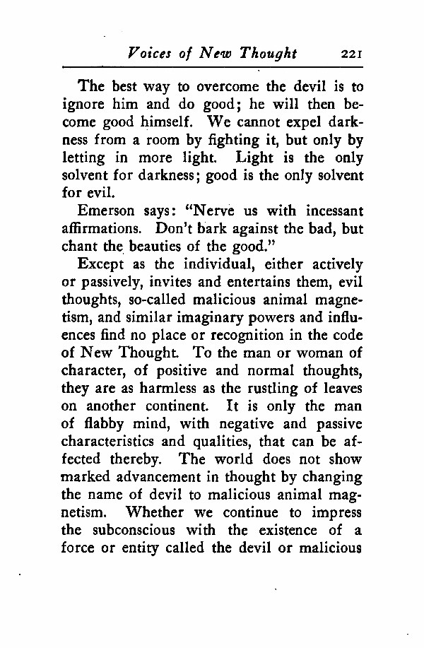 Except as the individual, either actively or passively, invites and entertains them, evil thoughts, so-called malicious animal magnetism, and similar imaginary powers and influences find no place or recognition in the code of New Thought. To the man or woman of character, of positive and normal thoughts, they are as harmless as the rustling of leaves on another continent. It is only the man of flabby mind, with negative and passive characteristics and qualities, that can be affected thereby. The world does not show marked advancement in thought by changing the name of devil to malicious animal magnetism. Whether we continue to impress the subconscious with the existence of a force or entity called the devil or malicious