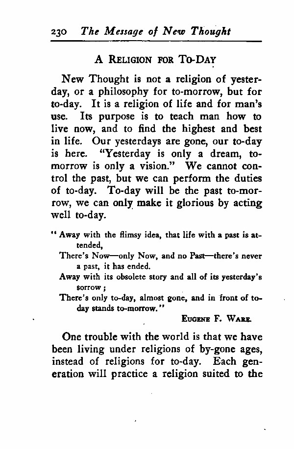 New Thought is not a religion of yesterday, or a philosophy for tomorrow but for today. It is a religion of life and for man's use. Its purpose is to teach man how to live now, and to find the highest and best in life. Our yesterdays are gone, our today is here. "Yesterday is only a dream, tomorrow is only a vision." We cannot control the past, but we can perform the duties of today. Today will be the past tomorrow, we can only make it glorious by acting well today.