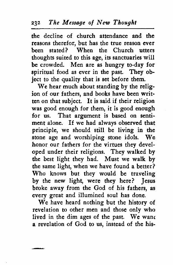We hear much about standing by the religion of our fathers, and books have been written on that subject. It is said if their religion was good enough for them, it is good enough for us. That argument is based on sentiment alone. If we had always observed that principle, we should still be living in the stone age and worshiping stone idols. We honor our fathers for the virtues they developed under their religions. They walked by the best light they had. Must we walk by the same light, when we have found a better? Who knows but they would be traveling by the new light, were they here? Jesus broke away from the God of his fathers. as every great and illumined soul has done.