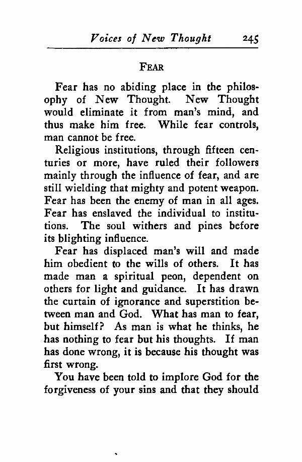 Fear has no abiding place in the philosophy of New Thought. New Thought would eliminate it from man's mind, and thus make him free. While fear controls, man cannot be free.