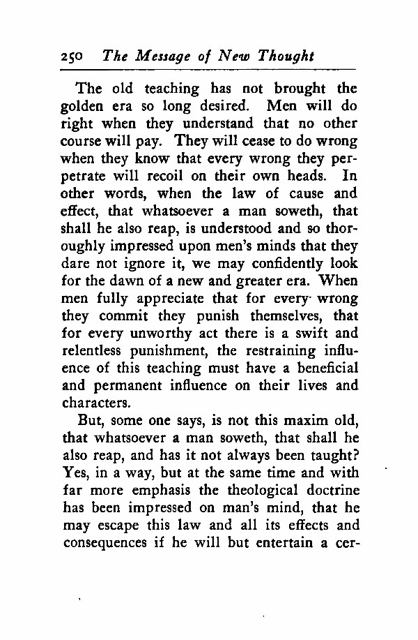 The old teaching has not brought the golden era so long desired. Men will do right when they understand that no other course will pay. They will cease to do wrong when they know that every wrong they perpetrate will recoil on their own heads. In other words, when the law of cause and effect, that whatsoever a man soweth, that shall he also reap, is understood and so thoroughly impressed upon men's minds that they dare not ignore it, we may confidently look for the dawn of a new and greater era. When men fully appreciate that for every wrong they commit they punish themselves, that for every unworthy act there is a swift and relentless punishment, the restraining influence of this teaching must have a beneficial and permanent influence on their lives and characters.