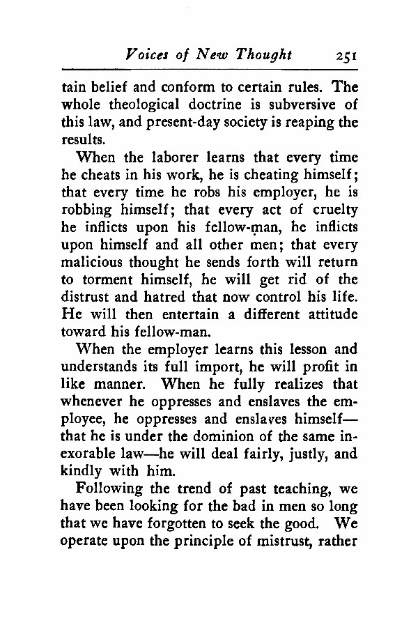 When the laborer learns that every time he cheats in his work, he is cheating himself; that every time he robs his employer, he is robbing himself; that every act of cruelty he inflicts upon his fellow-man, he inflicts upon himself and all other men; that every malicious thought he sends forth will return to torment himself, he will get rid of the distrust and hatred that now control his life. He will then entertain a different attitude toward his fellow-man.