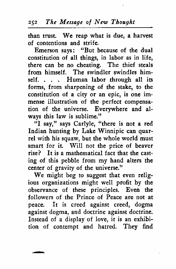 Emerson says: "But because of the dual constitution of all things, in labor as in life, there can be no cheating. The thief steals from himself. The swindler swindles himself.... Human labor through all its forms, from sharpening of the stake, to the constitution of a city or an epic, is one immense illustration of the perfect compensation of the universe, Everywhere and always this law is sublime."