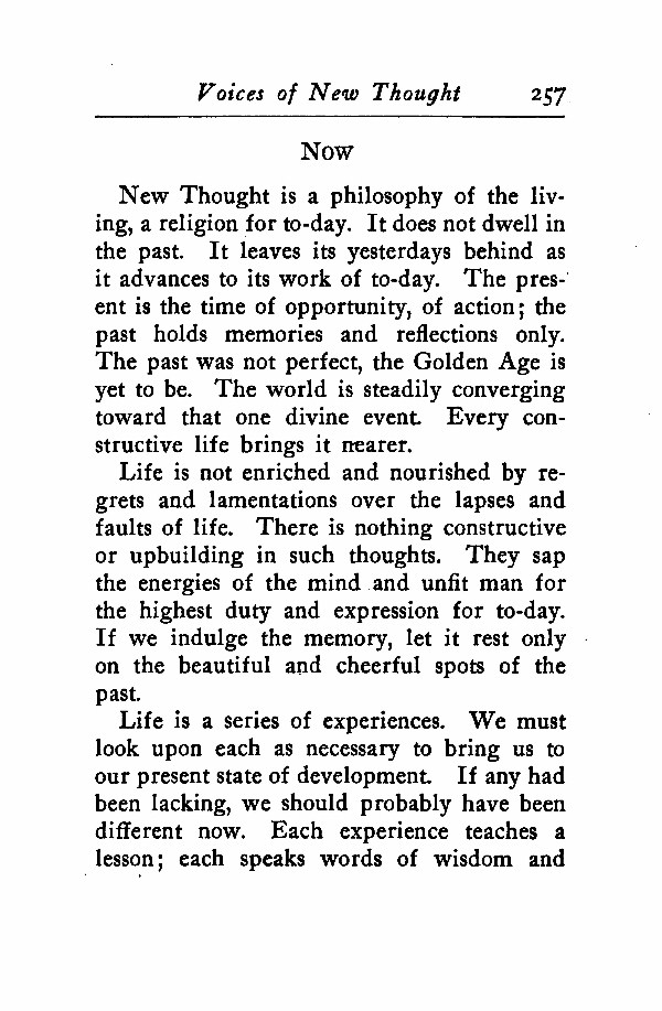 NOW New Thought is a philosophy of the living, a religion for today. It does not dwell in the past. It leaves its yesterdays behind as it advances to its work of today. The present is the time of opportunity, of action; the past holds memories and reflections only. The past was not perfect, the Golden Age is yet to be. The world is steadily converging toward that one divine event. Every constructive life brings it nearer.