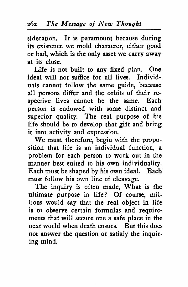Life is not built to any fixed plan. One ideal will not suffice for all lives. Individuals cannot follow the same guide, because all persons differ and the orbits of their respective lives cannot be the same. Each person is endowed with some distinct and superior quality. The real purpose of his life should be to develop that gift and bring it into activity and expression.