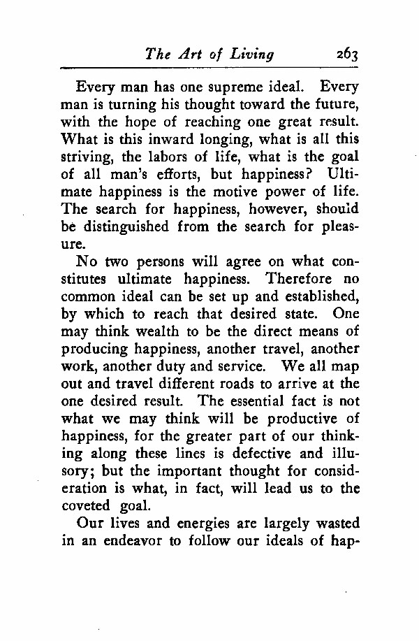 No two persons will agree on what constitutes ultimate happiness. Therefore no common ideal can be set up and established, by which to reach that desired state. One may think wealth to be the direct means of producing happiness, another travel. another work, another duty and service. We all map out and travel different roads to arrive at the one desired result. The essential fact is not what we may think will be productive of happiness, for the greater part of our thinking along these lines is defective and illusory; but the important thought for consideration is what, in fact, will lead us to the coveted goal.