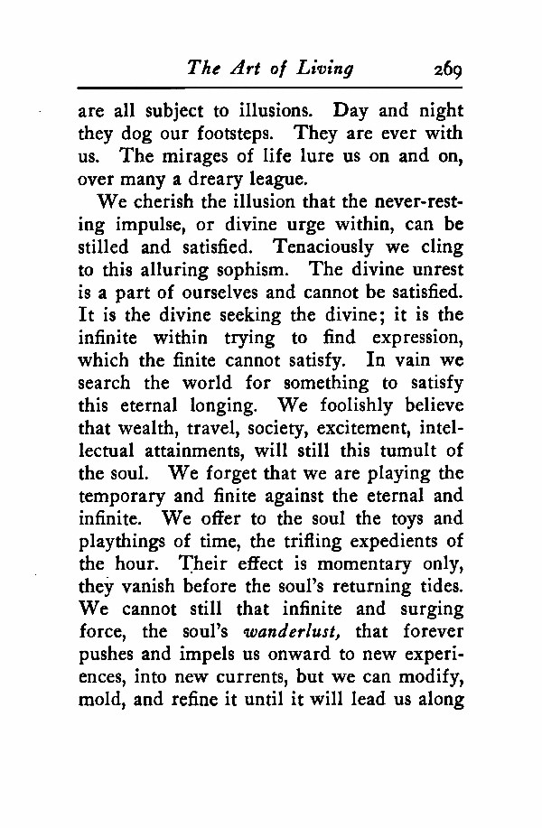 We cherish the illusion that the never-resting impulse, or divine urge within, can be stilled and satisfied. Tenaciously we cling to this alluring sophism. The divine unrest is a part of ourselves and cannot be satisfied. It is the divine seeking the divine; it is the infinite within trying to find expression, which the finite cannot satisfy. In vain we search the world for something to satisfy this eternal longing. We foolishly believe that wealth, travel, society, excitement, intellectual attainments, will still this tumult of the soul. We forget that we are playing the temporary and finite against the eternal and infinite. We offer to the soul the toys and playthings of time, the trifling expedients of the hour. Their effect is momentary only, they vanish before the soul's returning tides. We cannot still that infinite and surging force, the soul's wanderlust, that forever pushes and impels us onward to new experiences, into new currents, but we can modify, mold, and refine it until it will lead us along