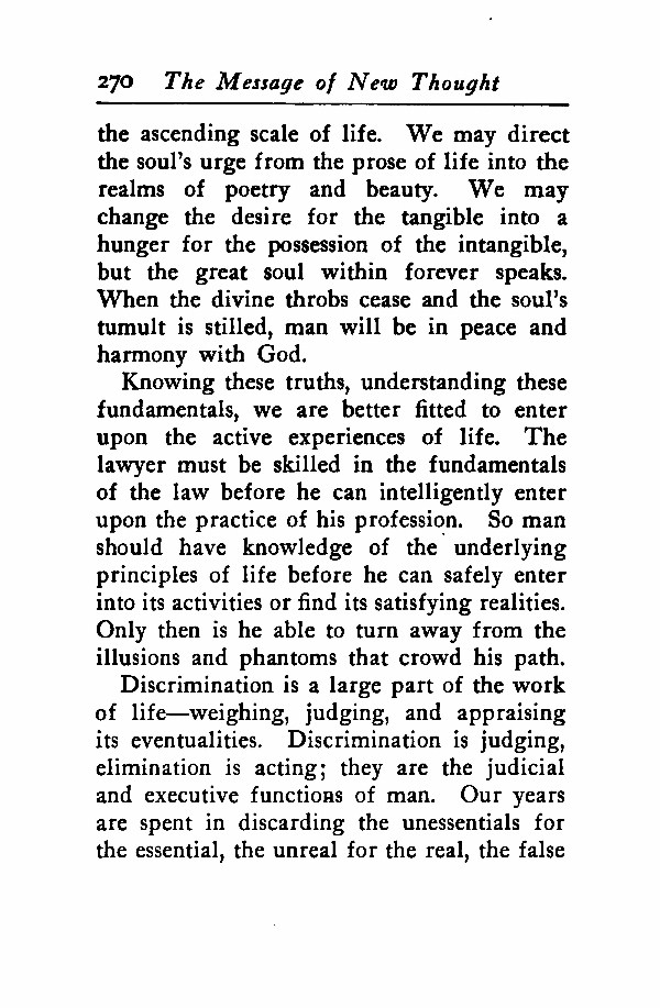 the ascending scale of life. We may direct the soul's urge from the prose of life into the realms of poetry and beauty. We may change the desire for the tangible into a hunger for the possession of the intangible, but the great soul within forever speaks. When the divine throbs cease and the soul's tumult is stilled, man will be in peace and harmony with God.