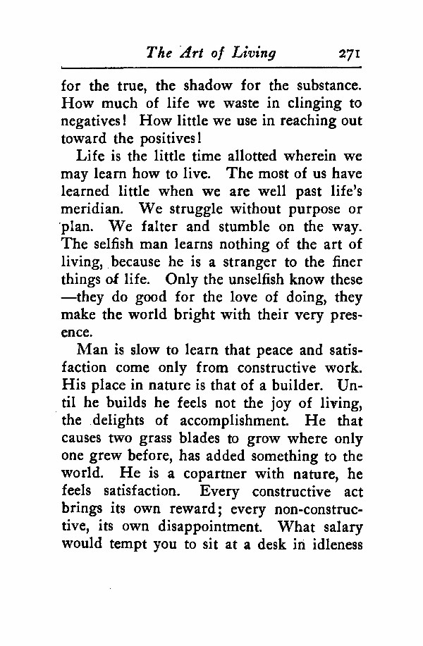 Man is slow to learn that peace and satisfaction come only from constructive work. His place in Nature is that of a builder. Until he builds he feels not the joy of living, the delights of accomplishment. He that causes two grass blades to grow where only one grew before, has added something to the world. He is a co-partner with Nature, he feels satisfaction. Every constructive act brings its own reward; every non-constructive, its own disappointment. What salary would tempt you to sit at a desk in idleness