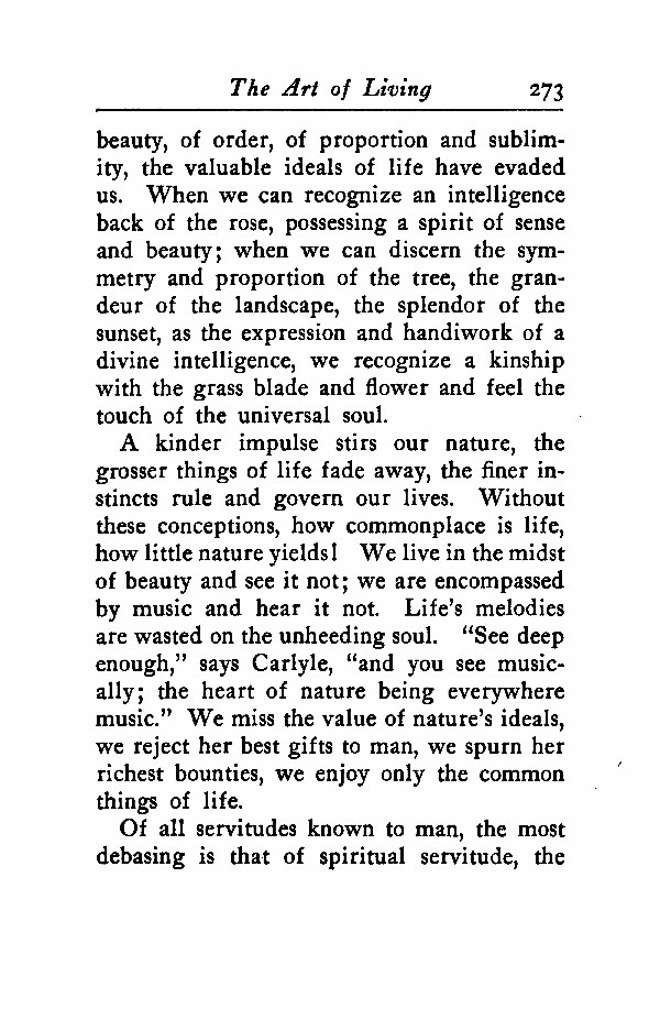 beauty, of order, of proportion and sublimity, the valuable ideals of life have evaded us. When we can recognize an intelligence back of the rose, possessing a spirit of sense and beauty; when we can discern the symmetry and proportion of the tree, the grandeur of the landscape, the splendor of the sunset, as the expression and handiwork of a divine intelligence, we recognize a kinship with the grass blade and flower and feel the touch of the universal soul.