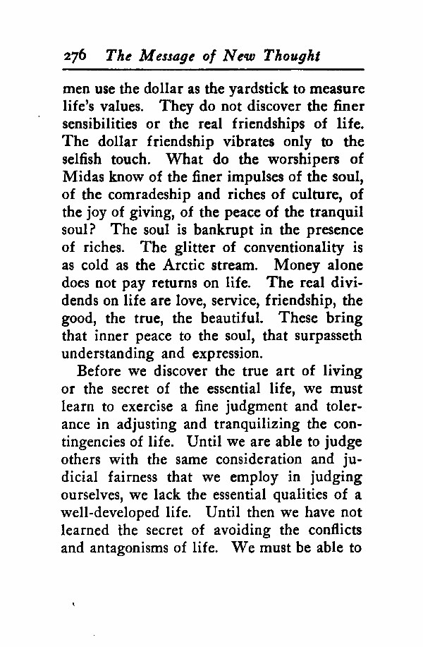 men use the dollar as the yardstick to measure life's values. They do not discover the finer sensibilities or the real friendships of life. The dollar friendship vibrates only to the selfish touch. What do the worshipers of Midas know of the finer impulses of the soul, of the comradeship and riches of culture, of the joy of giving, of the peace of the tranquil soul? The soul is bankrupt in the presence of riches. The glitter of conventionality is as cold as the Arctic stream. Money alone does not pay returns on life. The real dividends on life are love, service, friendship, the good, the true, the beautiful. These bring that inner peace to the soul, that surpasseth understanding and expression.