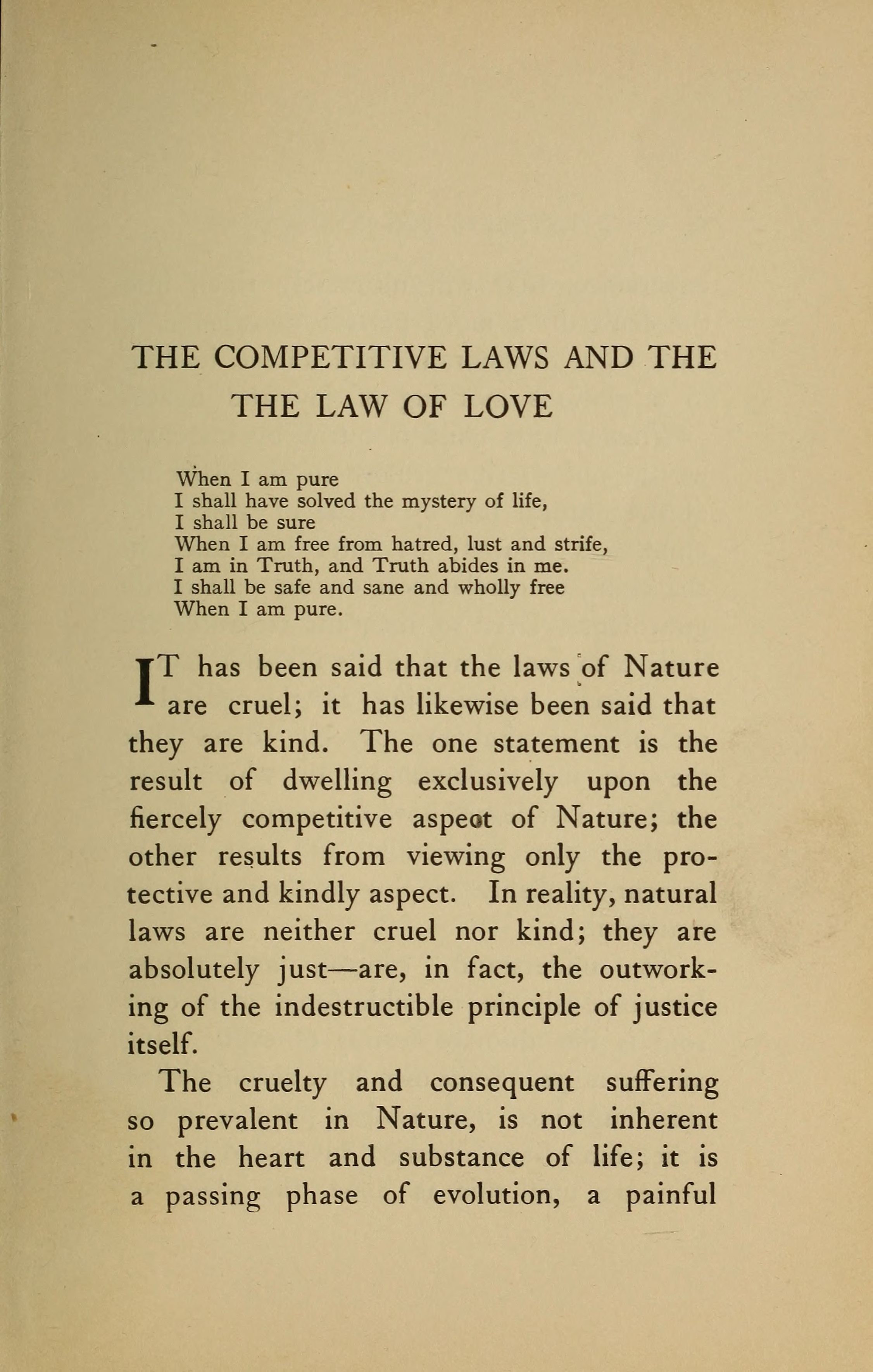 Contents - Preface - Foreword - The Soul’s Great Need - Competitive Laws and The Law of Love - Finding of a Principle - At Rest in The Kingdom and All Things Added - Divine Centre - Eternal Now - "Original Simplicity" - Unfailing Wisdom - Might of Meekness - Righteous Man - Perfect Love - Perfect Freedom - Greatness and Goodness - Heaven in the Heart -