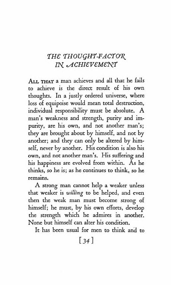 All that a man achieves and all that he fails to achieve is the direct result of his own thoughts. In a justly ordered universe, where loss of equipoise would mean total destruction, individual responsibility must be absolute. A man's weakness and strength, purity and impurity, are his own, and not another man's. They are brought about by himself, and not by another; and they can only be altered by himself, never by another. His condition is also his own, and not another man's. His suffering and his happiness are evolved from within. As he thinks, so he is; as he continues to think, so he remains.