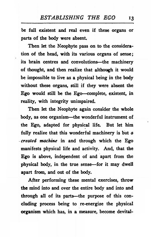 Then let the Neophyte again consider the whole body, as one organism --- the wonderful instrument of the Ego, adapted for physical life. But let him fully realize that this wonderful machinery is but a created machine in and through which the Ego manifests physical life and activity. And, that the Ego is above, independent of and apart from the physical body, in the true sense --- for it may dwell apart from, and out of the body.