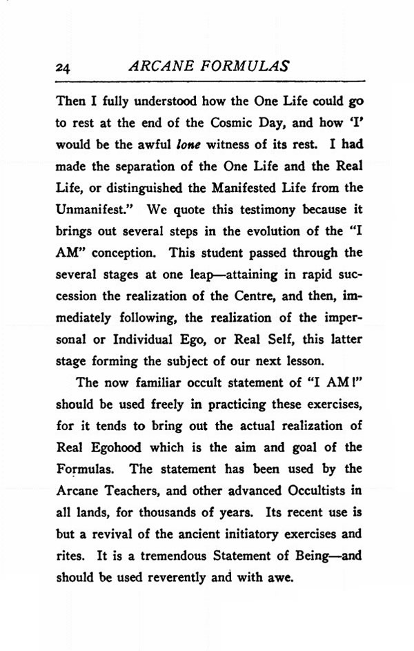 The now familiar occult statement of "I AM!" should be used freely in practicing these exercises, for it tends to bring out the actual realization of Real Egohood which is the aim and goal of the Formulas. The statement has been used by the Arcane Teachers, and other advanced Occultists in all lands, for thousands of years. Its recent use is but a revival of the ancient initiatory exercises and rites. It is a tremendous Statement of Being --- and should be used reverently and with awe.