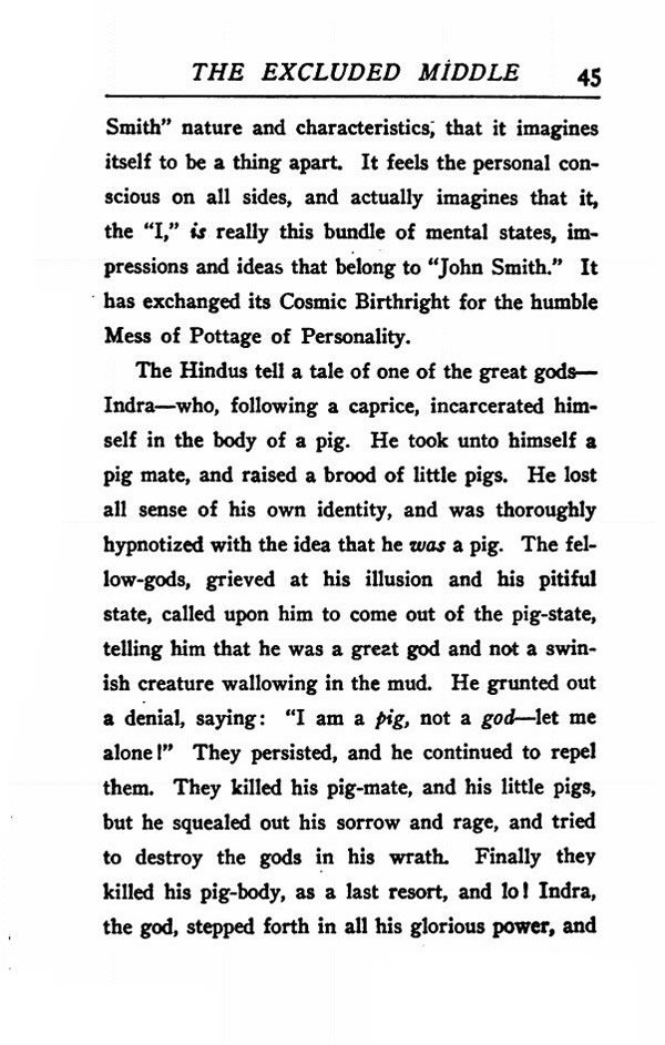 The Hindus tell a tale of one of the great gods Indra --- who, following a caprice, incarcerated himself in the body of a pig. He took unto himself a pig mate, and raised a brood of little pigs. He lust all sense of his own identity, and was thoroughly hypnotized with the idea that he was a pig. The fellow-gods, grieved at his illusion and his pitiful state, called upon him to come out of the pig-state, telling him that he was a great god and not a swinish creature wallowing in the mud. He grunted out a denial, saying: "I am a pig, not a god --- let me alone I" They persisted, and he continued to repel them, They killed his pig-mate, and his little pigs, but he squealed out his sorrow and rage, and tried to destroy the gods in his wrath. Finally they killed his pig-body, as a last resort, and lo! Indra, the god, stepped forth in all his glorious power, and