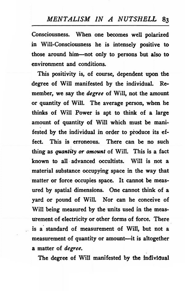 This positivity is, of course, dependent upon the degree of Will manifested by the individual. Remember, we say the degree of Will, not the amount or quantity of Will. The average person, when he thinks of Will Power is apt to think of a large amount of quantity of Will which must be manifested by the individual in order to produce its effect This is erroneous. There can be no such thing as quantity or amount of Will. This is a fact known to all advanced occultists. Will is not a material substance occupying space in the way that matter or force occupies space. It cannot be measured by spatial dimensions. One cannot think of a yard or pound of Will. Nor con he conceive of Will being measured by the units used in the measurement of electricity or other forms of force. There is a standard of measurement of Will, but not a measurement of quantity or amount --- it is altogether a matter of degree.
