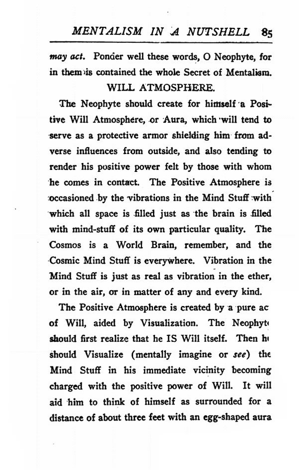 The Neophyte should create for himself a Positive Will Atmosphere, or Aura, which will tend to serve as a protective armor shielding him from adverse influences from outside, and also tending to render his positive power felt by those with whom he comes in contact. The Positive Atmosphere is occasioned by the vibrations in the Mind Stuff with which all space is filled just as the brain is filled with mind-stuff of its own particular quality. The Cosmos is a World Brain, remember, and the Cosmic Mind Stuff is everywhere. Vibration in the Mind Stuff is just as real as vibration in the ether, or in the air, or in matter of any and every kind.