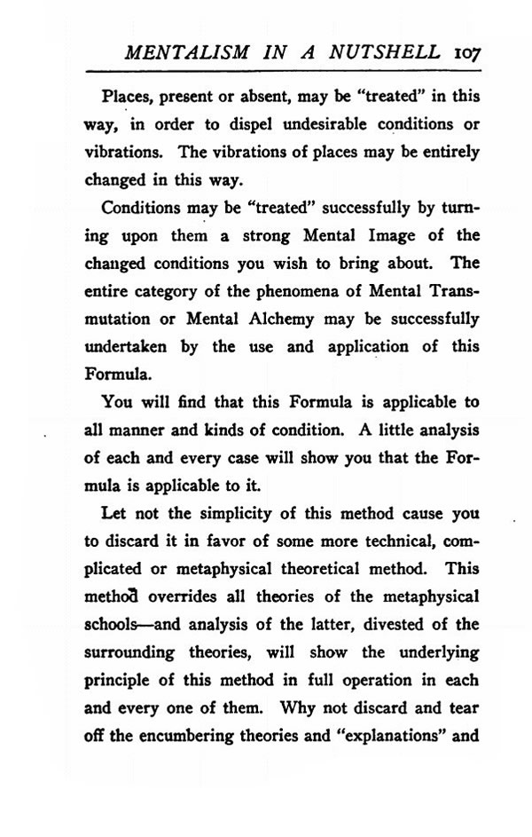 Conditions may be "treated" successfully by turning upon them a strong Mental Image of the changed conditions you wish to bring about. The entire category of the phenomena of Mental Transmutation or Mental Alchemy may be successfully undertaken by the use and application of this Formula.