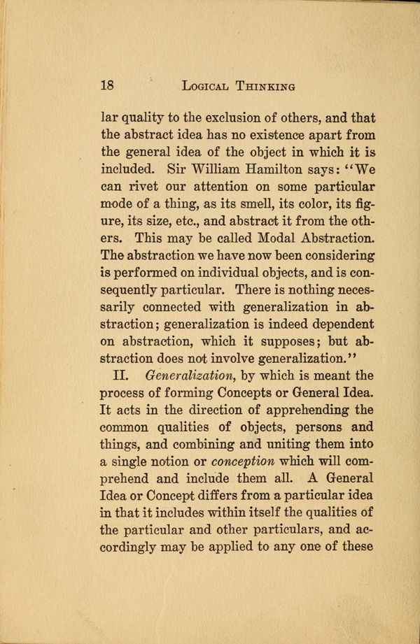 quality to the exclusion of others, and that the abstract idea has no existence apart from the general idea of the object in which it is included. Sir William Hamilton says: "We can rivet our attention on some particular mode of a thing, as its smell, its color, its figure, its size, etc., and abstract it from the others. This may be called Modal Abstraction. The abstraction we have now been considering is performed on individual objects, and is consequently particular. There is nothing necessarily connected with generalization in abstraction generalization is indeed dependent on abstraction, which it supposes but abstraction does not involve generalization."