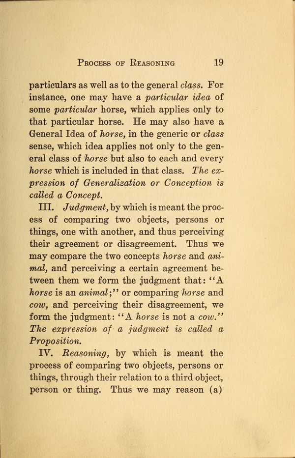 III. Judgment, by which is meant the process of comparing two objects, persons or things, one with another, and thus perceiving their agreement or disagreement. Thus we may compare the two concepts horse and animal, and perceiving a certain agreement between them we form the judgment that: "A horse is an animal;" or comparing 'horse and cow, and perceiving their disagreement, we form the judgment: "A horse is not a cow." The expression of a judgment is called a Proposition.