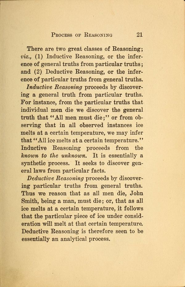 There are two great classes of Reasoning; viz., (1) Inductive Reasoning, or the inference of general truths from particular truths; and (2). Deductive Reasoning, or the inference of particular truths from general truths.