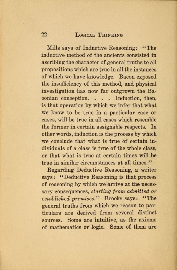 Mills says of Inductive Reasoning: "The inductive method of the ancients consisted in ascribing the character of general truths to all propositions which are true in all the instances of which we have knowledge. Bacon exposed the insufficiency of this method, and physical investigation has now far outgrown the Buchanan conception. . . . Induction, then, is that operation by which we infer that what we know to be true in a particular ease or cases, will be true in all cases which resemble the former in certain assignable respects. In other words, induction is the process by which we conclude that what is true of certain individuals of a class is true of the whole class, or that what is true at certain times will he true in similar circumstances at all times."