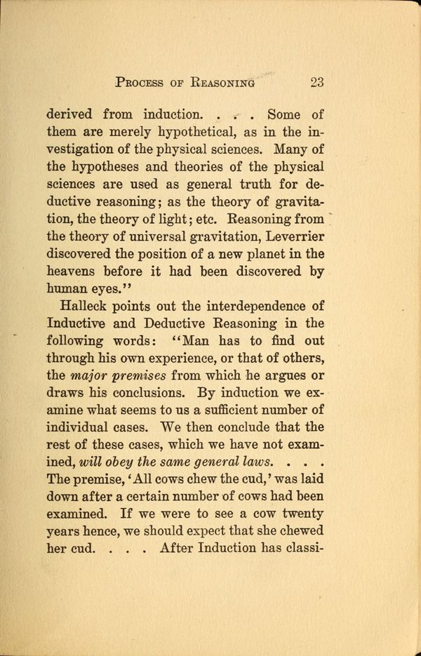 derived from induction. . . . Some of them are merely hypothetical, as in the investigation of the physical sciences. Many of the hypotheses and theories of the physical sciences are used as general truth for deductive reasoning; as the theory of gravitation, the theory of light; etc. Reasoning from the theory of universal gravitation, Leverrier discovered the position of a new planet in the heavens before it had been discovered by human eyes."