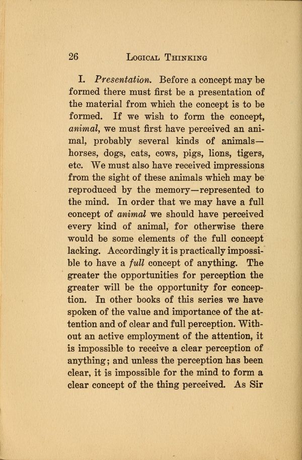 I. Presentation. Before a concept may be formed there must first be a presentation of the material from which the concept is to be formed. If we wish to form the concept, animal, we must first have perceived an animal, probably several kinds of animals— horses, dogs, cats, cows, pigs, lions, tigers, etc. We must also have received impressions from the sight of these animals which may be reproduced by the memory—represented to the mind. In order that we may have a full concept of animal we should have perceived every kind of animal, for otherwise there would be some elements of the full concept lacking. Accordingly it is practically impossible to have a full concept of anything. The greater the opportunities for perception the greater will be the opportunity for conception. In other books of this series we have spoken of the value and importance of the attention and of clear and full perception. Without an active employment of the attention, it is impossible to receive a clear perception of anything; and unless the perception has been clear, it is impossible for the mind to form a clear concept of the thing perceived. As Sir