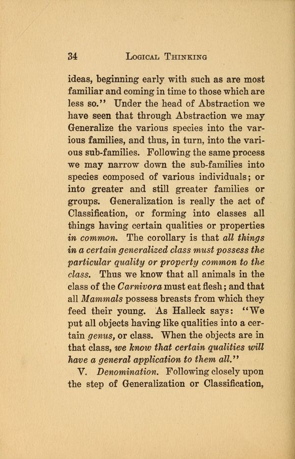 ideas, beginning early with such as are most familiar and coming in time to 'those which are less so." Under the head of Abstraction we have seen that through Abstraction we may Generalize the various species into the various families, and thus, in turn, into the various sub-families. Following the same process we may narrow down the sub-families into species composed of various individuals or into greater and still greater families or groups. Generalization is really the act of Classification, or forming into classes all things having certain qualities or properties in common. The corollary is that all things in a certain generalized class must possess the particular quality or property common to the class. Thus we know that all animals in the class of the Carnivora must eat flesh; and that all Mammals possess breasts from which they feed their young. As Halleck says: "We put all objects having like qualities into a certain genus, or class. When the objects are, in that class, we know that certain qualities will have a general application to them all."