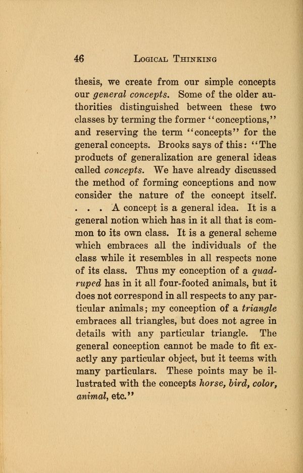 thesis, we create from our simple concepts our general concepts. Some of the older authorities distinguished between these two classes by terming the former "conceptions," and reserving the term "concepts" for the general concepts. Brooks says of this: " The products of generalization are general ideas called concepts. We have already discussed the method of forming conceptions and now consider the nature of the concept itself.