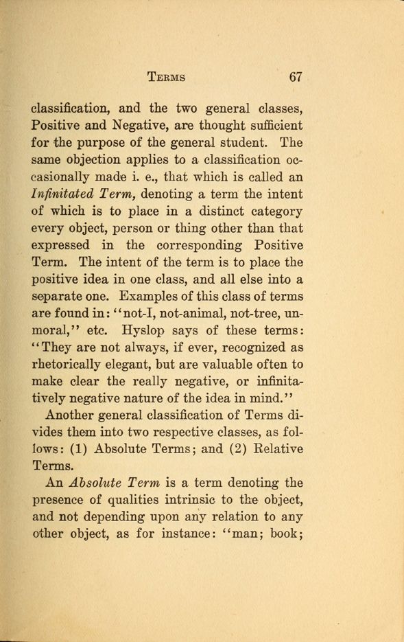 classification, and the two general classes, Positive and Negative, are thought sufficient for the purpose of the general student. The same objection applies to a classification occasionally made i. e., that which is called an Infinitated Term, denoting a term the intent of which is to place in a distinct category every object, person or thing other than that expressed in the corresponding Positive Term. The intent of the term is to place the positive idea in one class, and all else into a separate one. Examples of this class of terms are found in: "not-I, not-animal, not-tree, unmoral," etc. Hyslop says of these terms: " They are not always, if ever, recognized as rhetorically elegant, but are valuable often to make clear the really negative, or infinitatively negative nature of the idea in mind."
