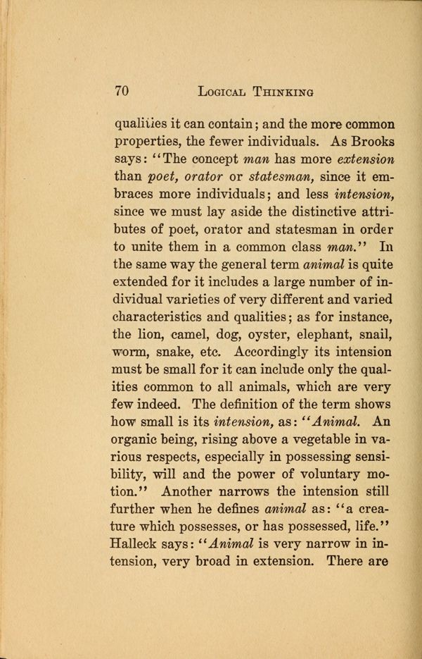 1 - Reasoning - 2 - Process of Reasoning - 3 - The Concept - 4 - The Use of Concepts - 5 - Concepts and Images - 6 - Terms - 7 - Meaning of Terms - 8 - Judgments - 9 - Propositions - 10 - Immediate Reasoning - 11 - Inductive Reasoning - 12 - Reasoning by Induction - 13 - Theory and Hypotheses - 14 - Making and Testing Hypotheses - 15 - Deductive Reasoning - 16 - The Syllogism - 17 - Varieties of Syllogisms - 18 - Reasoning by Analogy - 19 - Fallacies -