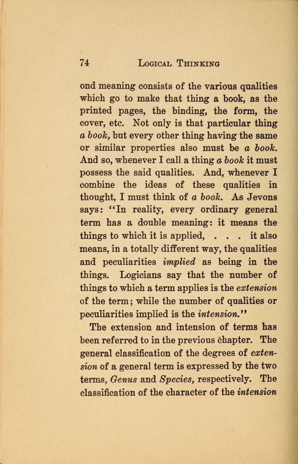 and meaning consists of the various qualities which go to make that thing a book, as the printed pages, the binding, the form, the cover, etc. Not only is that particular thing a book, but every other thing having the same or similar properties also must be a book. And so, whenever I call a. thing a book it must possess the said qualities. And, whenever I combine the ideas of these qualities in thought, I must think of a book. As Jevons says: "In reality, every ordinary general term has a double meaning: it means the things to which it is applied, . . . it also means, in a totally different way, the qualities and peculiarities implied as being in the things. Logicians say that the number of things to which a term applies is the extension of the term while the number of qualities or peculiarities implied is the intension."