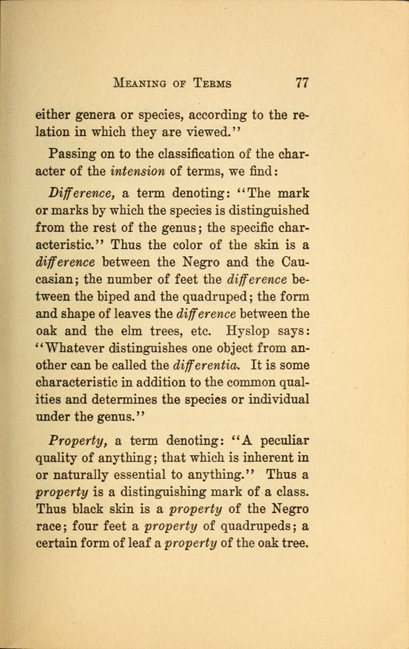 Difference, a term denoting: "The mark or marks by which the species is distinguished from the rest of the genus; the specific characteristic." Thus the color of the skin is a difference between the Negro and the Caucasian; the number of feet the difference between the biped and the quadruped; the form and shape of leaves the difference between the oak and the elm trees, etc. Hyslop says: "Whatever distinguishes one object from another can be called the differentia. It is some characteristic in addition to the common qualities and determines the species or individual under the genus."