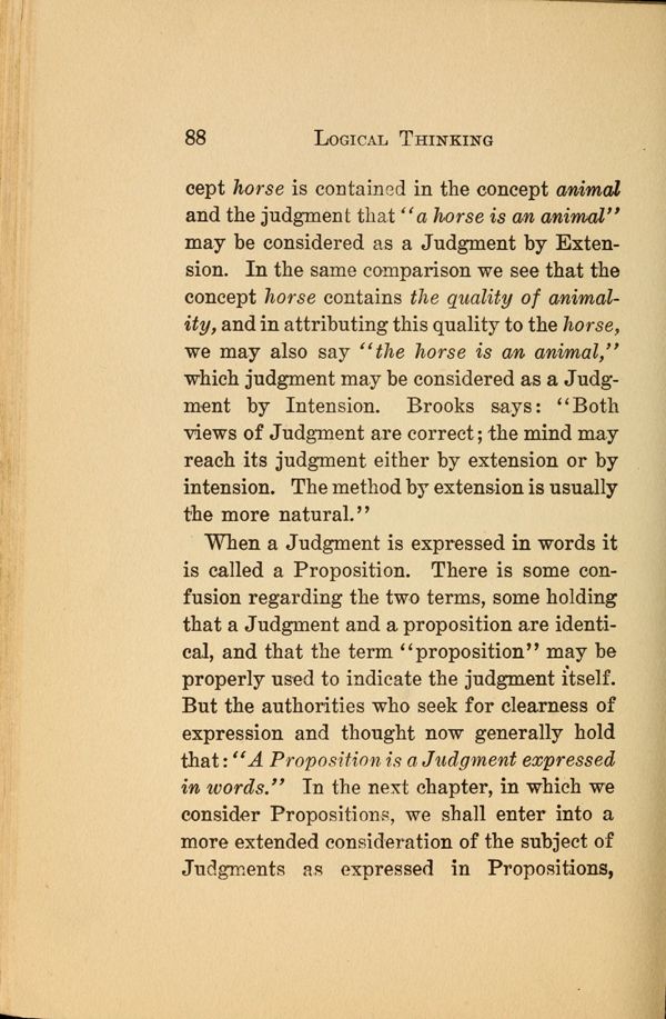 horse is contained in the concept animal and the judgment that "a horse is an animal" may be considered as a Judgment by Extension. In the same comparison we see that the concept horse contains the quality of animality, and in attributing this quality to the horse, we may also say "the horse is an animal," which judgment may be considered as a Judgment by Intension. Brooks says: "Both views of Judgment are correct; the mind may reach its judgment either by extension or by intension. The method by extension is usually the more natural."