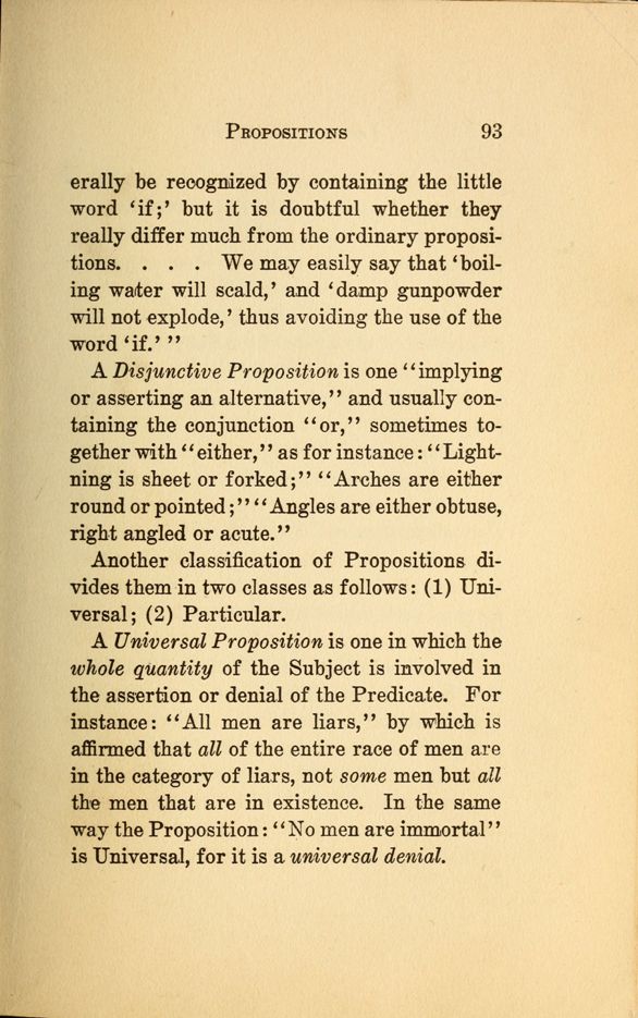 be recognized by containing the little word 'if,' but it is doubtful whether they really differ much from the ordinary propositions. . . We may easily say that 'boiling water will scald,' and damp gunpowder will not explode,' thus avoiding the use of the word `if.'"