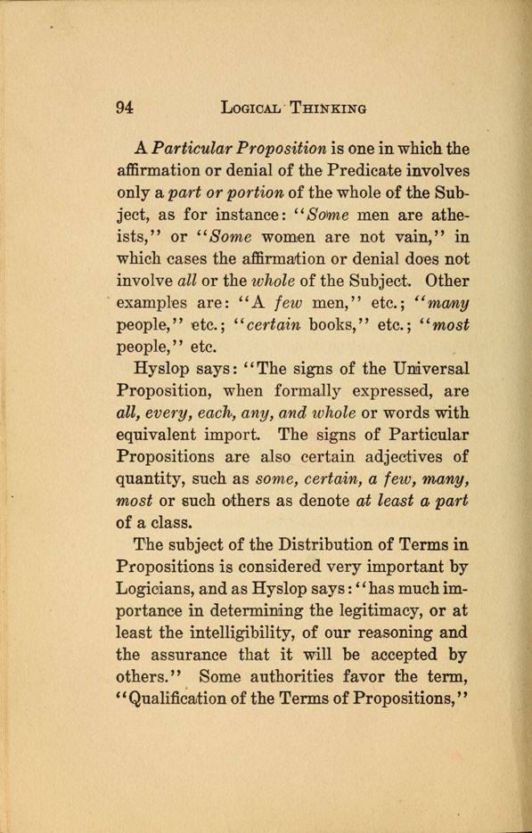 Hyslop says " The signs of the -Universal Proposition, when formally expressed, are all, every, each, any, and whole or words with equivalent import. The signs of Particular Propositions are also certain adjectives of quantity, such as some, certain, a few, many, most or such others as denote at least a part of a class.