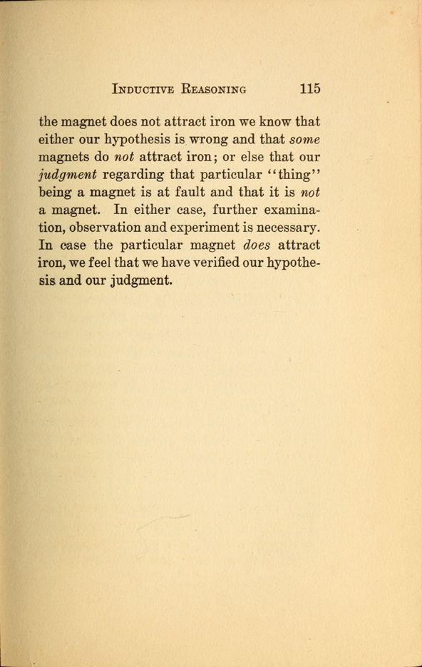 1 - Reasoning - 2 - Process of Reasoning - 3 - The Concept - 4 - The Use of Concepts - 5 - Concepts and Images - 6 - Terms - 7 - Meaning of Terms - 8 - Judgments - 9 - Propositions - 10 - Immediate Reasoning - 11 - Inductive Reasoning - 12 - Reasoning by Induction - 13 - Theory and Hypotheses - 14 - Making and Testing Hypotheses - 15 - Deductive Reasoning - 16 - The Syllogism - 17 - Varieties of Syllogisms - 18 - Reasoning by Analogy - 19 - Fallacies -