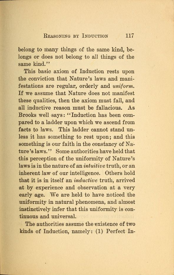 This basic axiom of Induction rests upon the conviction that Nature's laws and manifestations are regular, orderly and uniform. If we assume that Nature does not manifest these qualities, then the axiom must fall, and all inductive reason must be fallacious. As Brooks well ,says: "Induction has been compared to a ladder upon which we ascend from facts to laws. This ladder cannot stand unless it has something to rest upon; and this something is our faith in the constancy of Nature's laws. " Some authorities, have held that this perception of the uniformity of Nature's laws is in the nature of an intuitive truth, or an inherent law of our intelligence. Others hold that it is in itself an inductive truth, arrived at by experience and observation at a very early age. We are held to have noticed the uniformity in natural phenomena, and almost instinctively infer that this uniformity is continuous and universal.