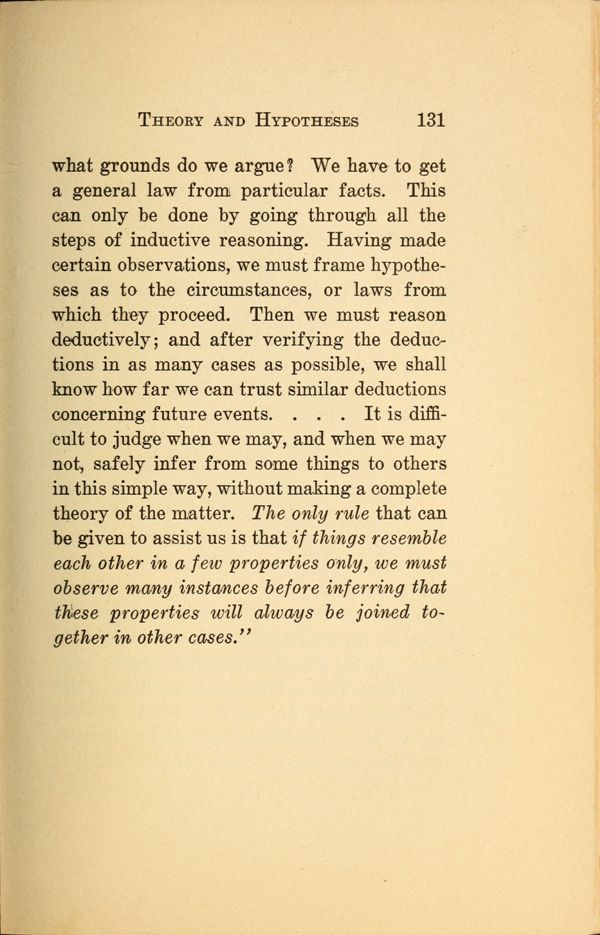 1 - Reasoning - 2 - Process of Reasoning - 3 - The Concept - 4 - The Use of Concepts - 5 - Concepts and Images - 6 - Terms - 7 - Meaning of Terms - 8 - Judgments - 9 - Propositions - 10 - Immediate Reasoning - 11 - Inductive Reasoning - 12 - Reasoning by Induction - 13 - Theory and Hypotheses - 14 - Making and Testing Hypotheses - 15 - Deductive Reasoning - 16 - The Syllogism - 17 - Varieties of Syllogisms - 18 - Reasoning by Analogy - 19 - Fallacies -