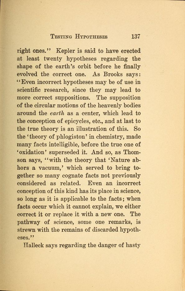 right ones." Kepler is said to have erected at least twenty hypotheses regarding the shape of the earth's orbit before he finally evolved the correct one. As Brooks says: "Even incorrect hypotheses may be of use in scientific research, since they may lead to more correct suppositions. The supposition of the circular motions of the heavenly bodies around the earth as a center, which lead to the conception of epicycles, etc., and at last to the true theory is an illustration of this. So the 'theory of phlogiston' in chemistry, made many facts intelligible, before the true one of 'oxidation' superseded it. And so, as Thomson says, "with the theory that 'Nature abhors a vacuum,' which served to bring together so many cognate facts not previously considered as related. Even an incorrect conception of this kind has its place in science, so long as it is applicable to the facts; when facts occur which it cannot explain, we either correct it or replace it with a new one. The pathway of science, some one remarks, is strewn with the remains of discarded hypotheses."