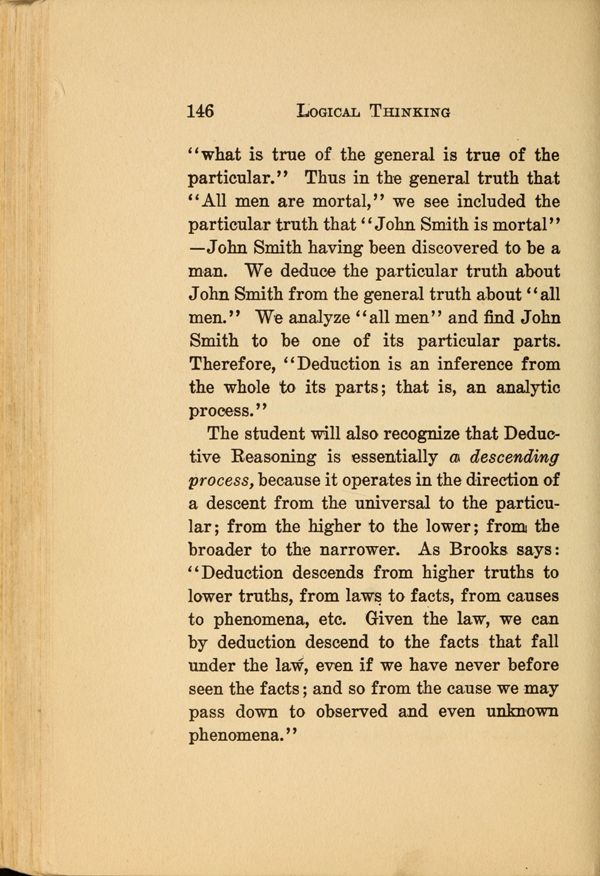 "what is true of the general is true of the particular." Thus in the general truth that "All men are mortal," we see included the particular truth that "John Smith is mortal" —John Smith having been discovered to be a man. We deduce the particular truth about John Smith from the general truth about " all men." We analyze "all men" and find John Smith to be one of its particular parts. Therefore, "Deduction is an inference from the whole to its parts that is, an analytic process."