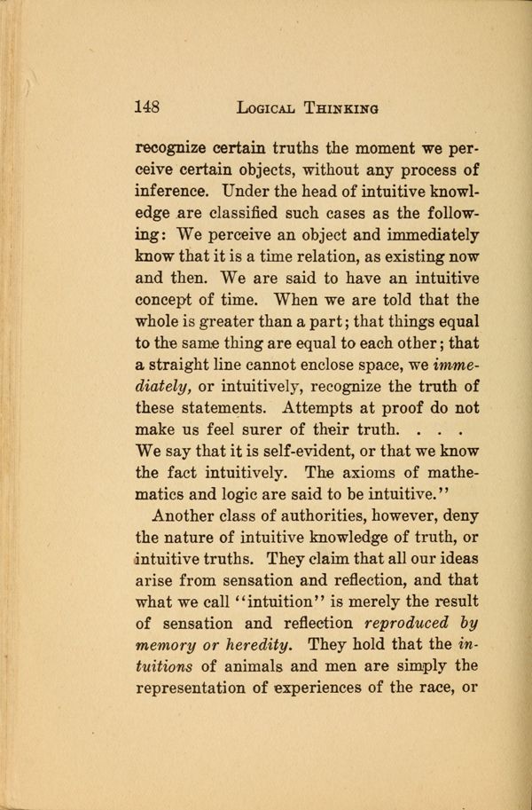 recognize certain truths the moment we perceive certain objects, without any process of inference. Under the head of intuitive knowledge are classified such cases as the following: We perceive an object and immediately know that it is a time relation, as existing now and then. We are said to have an intuitive concept of time. When we are told that the whole is greater than a part; that things equal to the same thing are equal to each other; that a straight line cannot enclose space, we immediately, or intuitively, recognize the truth of these statements. Attempts at proof do not make us feel surer of their truth. . .