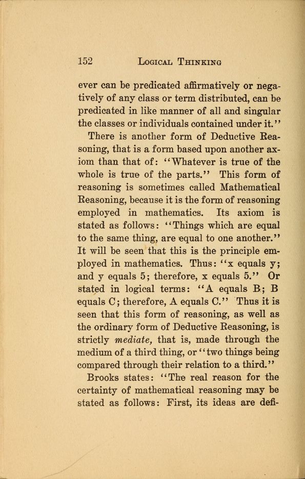 There is another form of Deductive Reasoning, that is a form based upon another axiom than that of: "Whatever is true of the whole is true of the parts." This form of reasoning is sometimes called Mathematical Reasoning, because it is the form of reasoning employed in mathematics. Its axiom is stated as follows: " Things which are equal to the same thing, are equal to one another." It will be seen that this is the principle employed in mathematics.. Thus: "x equals y; and y equals 5; therefore, x equals 5." Or stated in logical terms: "A equals B; B equals C; therefore, A equals C." Thus it is seen that this form of reasoning, as well as the ordinary form of Deductive Reasoning, is strictly mediate, that is, made through the medium of a third thing, or " two things being compared through their relation to a third."