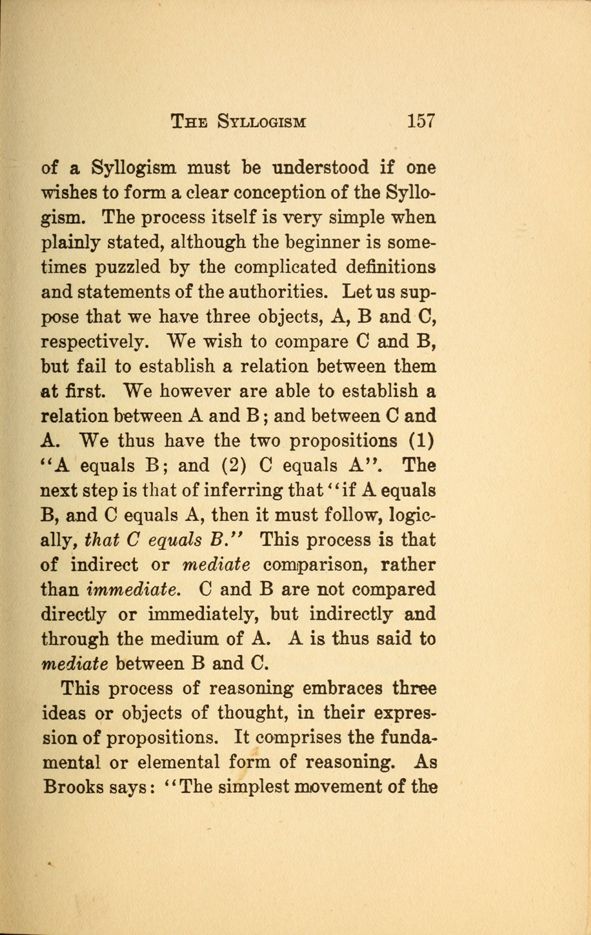 This process of reasoning embraces three ideas or objects of thought, in their expression of propositions. It comprises the fundamental or elemental form of reasoning. As Brooks says "The simplest movement of the
