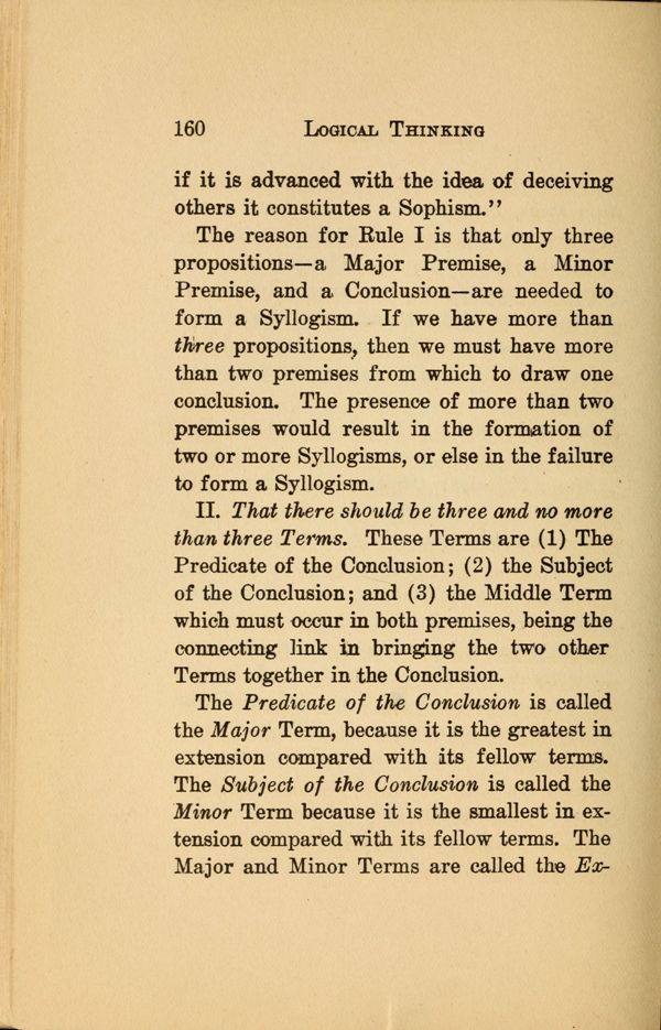 II. That there should be three and no more than three Terms. These Terms are (1) The Predicate of the Conclusion; (2) the Subject of the Conclusion; and (3) the Middle Term which must occur in both premises, being the connecting link in bringing the two other Terms together in the Conclusion.