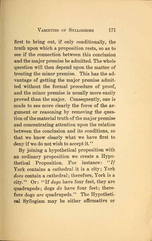 first to bring out, if only conditionally, the truth upon which a. proposition rests, so as to see if the connection between this conclusion and the major premise be admitted. The whole question will then depend upon the matter of treating the minor premise. This has the advantage of getting the major premise admitted without the formal procedure of proof, and the minor premise is usually more easily proved than the major. Consequently, one is made to see more clearly the force of the argument or reasoning by removing the question of the material truth of the major premise and concentrating attention upon the relation between the conclusion and its conditions, so that we know clearly what we have first to deny if we do not wish to accept it."
